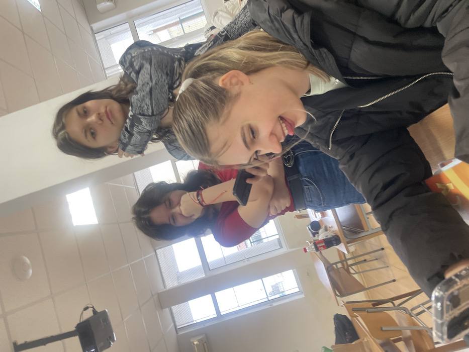 The image depicts three young females in what appears to be a classroom or educational facility in Panagyurishte, Bulgaria. In the foreground, a female with blonde hair tied in a ponytail wears a black puffer jacket and a light-colored top, smiling broadly with her tongue slightly extended. She holds a smartphone in a clear case with her right hand, positioned as if taking a selfie or recording. Her left arm rests on a surface, partially obscuring an object with an orange design. To her left and slightly behind, a second female with dark, medium-length hair, dressed in a red short-sleeved top and blue jeans with a dark belt, covers her mouth with her right hand in an expression of amusement or laughter. She wears multiple red bracelets on her right wrist and holds a black smartphone in her left hand. Further in the background, a third female with long, dark hair, wearing a dark and light patterned long-sleeved top, maintains a neutral to slightly serious expression while looking directly towards the camera. Her left arm is bent across her chest. The environment features light-colored walls, large windows providing natural light, and a white ceiling with multiple fluorescent panel lights, a ceiling-mounted projector, and a circular smoke detector. An air conditioning unit is visible on the wall near the windows. Wooden desks and chairs are arranged in the background, with a plastic bottle of Coca-Cola and other items visible on one desk. The scene captures a casual, interactive moment among the individuals.
