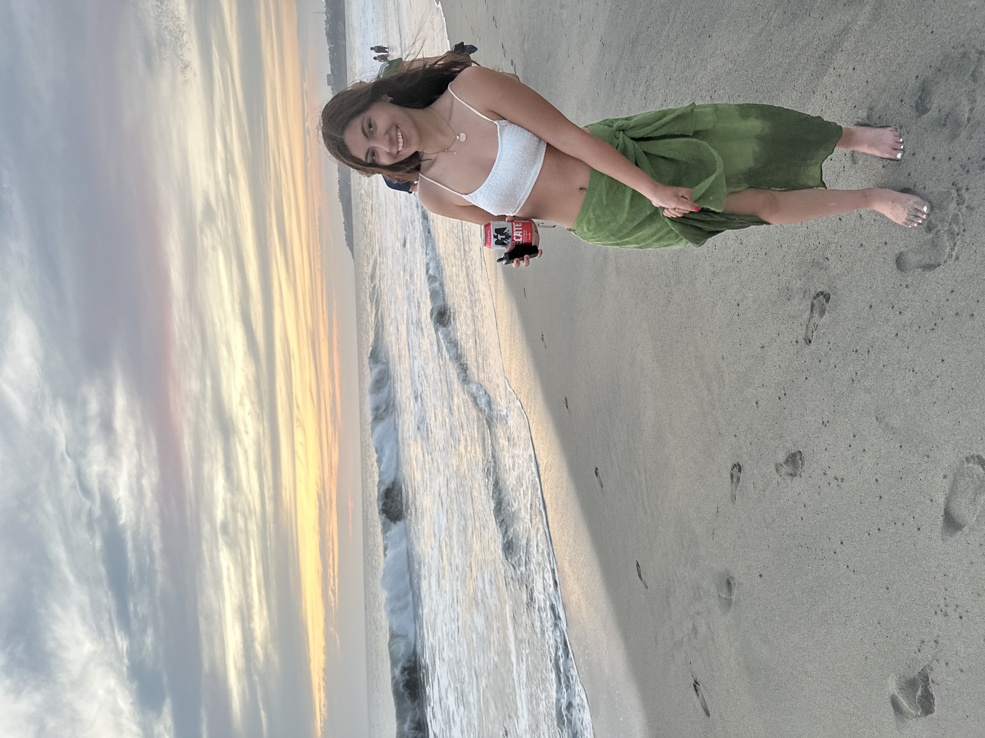 A young woman stands on the beach at Brisas de Zicatela, Mexico. She is wearing a white top and a green wrap. She holds a can and what appears to be a vaping device. The beach is sandy with footprints visible. The ocean is to her left and the sky is filled with the colors of a sunset.