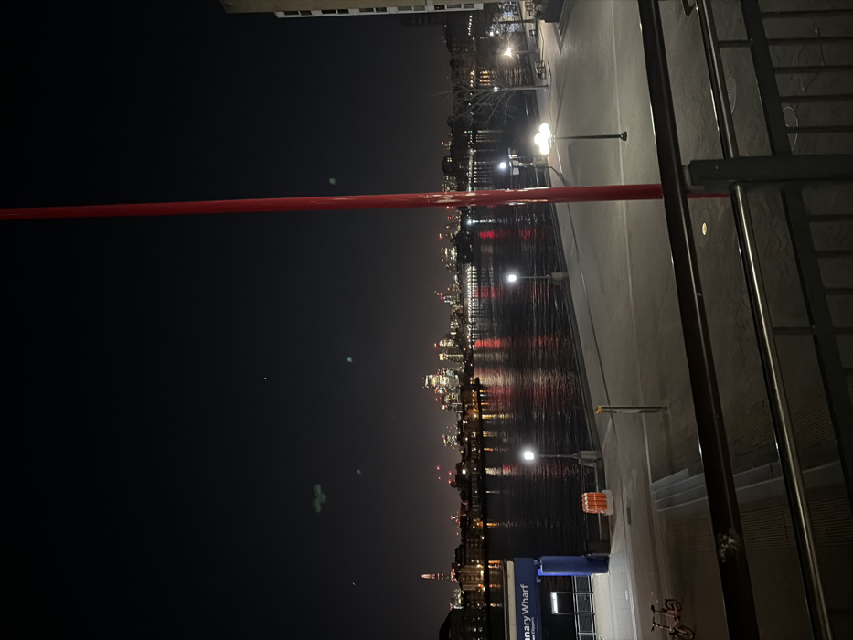 The image captures a nighttime view of the River Thames in London, United Kingdom. The vantage point is from the north bank of the Thames, specifically from the Canary Wharf area, looking northwest across the river towards the illuminated skyline of the City of London. In the immediate foreground, a dark metal railing with horizontal bars and vertical posts is present, suggesting a balcony or elevated platform. A thick, vertical red pole rises from the bottom of the frame towards the upper right, partially obstructing the view. On the near bank, a paved promenade runs parallel to the river. Multiple streetlights with white illumination are positioned along this walkway. To the left, a blue structure with a canopy is visible, displaying the partially obscured text "Canary Wharf River Clipper," indicating a ferry pier or station entrance. Two bicycles, one with pink detailing, are parked near this blue structure, next to a set of concrete steps. Orange cylindrical barriers or bins are also situated near the pier entrance. Further along the promenade to the right, leafless trees and park benches are discernible under additional streetlights, one featuring three globes. The midground is dominated by the dark, calm surface of the River Thames, reflecting the city lights and streetlights as shimmering streaks. In the background, a brightly illuminated city skyline stretches across the horizon under a dark night sky. This skyline features numerous buildings, including The Shard skyscraper visible on the far left. Many buildings exhibit small, bright red lights at their peaks. The dark sky contains faint lens flares or internal reflections from the camera optics, appearing as subtle green or light blue circular artifacts. No individuals are present in the scene.