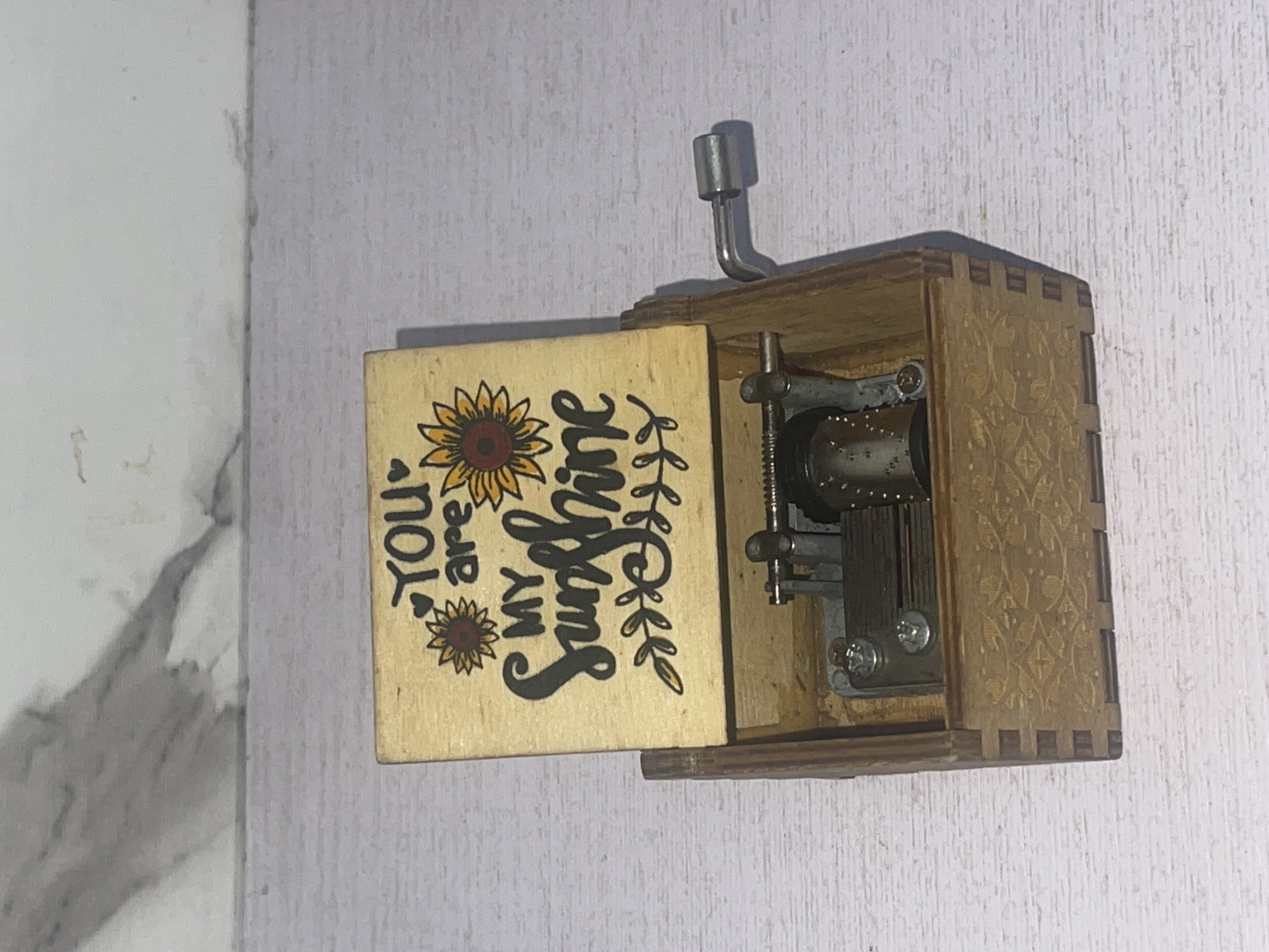 wooden music box with a hinged lid open, revealing the inner mechanism. The lid is decorated with a sunflower design and the words "You are my Sunshine." A metal crank is attached to the side of the box. The background is a textured white surface, possibly a wall. The location in Abraka, Nigeria, is not discernible from the image.