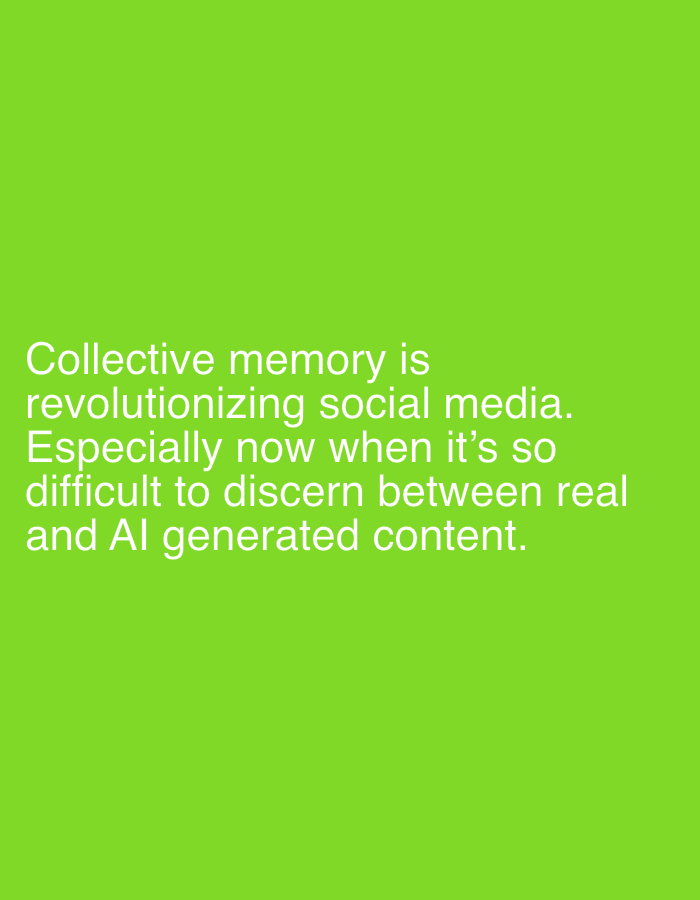 A green background displays white text that reads, "Collective memory is revolutionizing social media. Especially now when it's so difficult to discern between real and AI generated content." The statement highlights the impact of collective memory on social media and the challenges in distinguishing between authentic and artificial intelligence-created content. The minimal design focuses on the message and its implications.