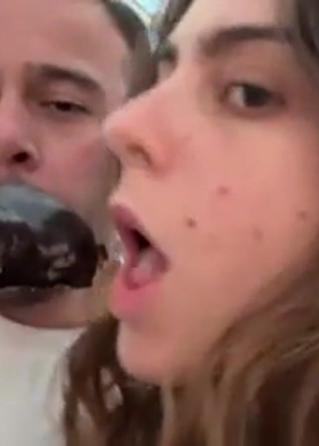 A man and a woman are eating from a brown paper bag. The woman has long brown hair and is taking a bite of a dark colored food item. The man is holding the bag, and then takes a bite as well. They are in a well-lit area, possibly an airport, as signs are visible overhead. The man is wearing a white shirt with a black strap, and the woman is wearing a light colored top. The woman appears to be chewing with her mouth closed.