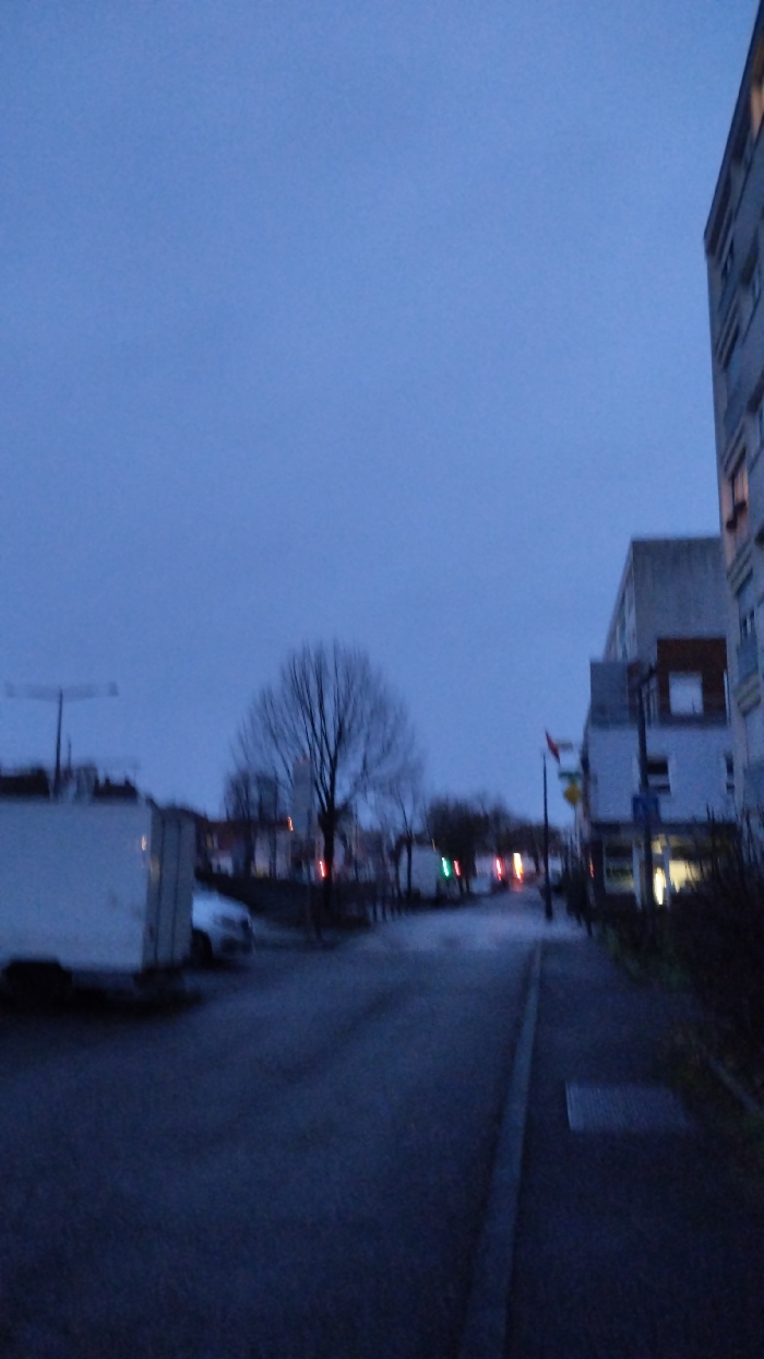 A blurry image depicts a street in twilight. Buildings line the right, and a white van is visible on the left. A bare tree stands in the middle distance. Streetlights illuminate the road, which recedes into the dark. The sky is a pale blue, indicating either early morning or late evening. Overall the image is grainy and indistinct.