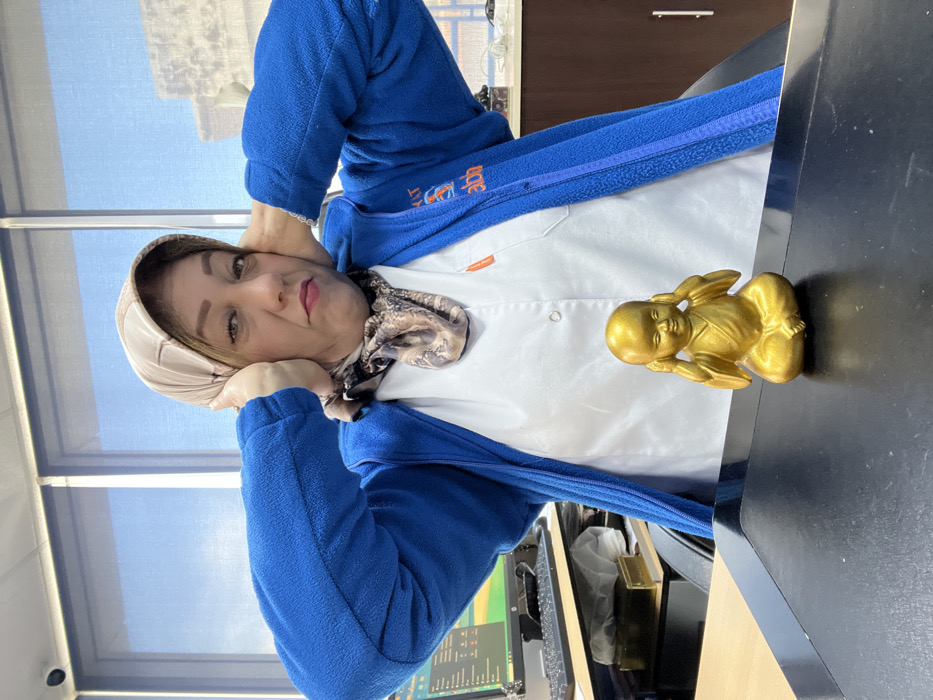 This image depicts an indoor office environment. A middle-aged woman is positioned centrally, viewed from the chest up. She wears a beige patterned headscarf, a white uniform-style top, and a dark blue fleece jacket with "Abab" text visible on the right chest area. Both of her hands are pressed against the sides of her head, covering her ears, mimicking the "hear no evil" gesture. She maintains a direct gaze towards the viewer with a neutral to slightly displeased expression. In the foreground, on a dark desk surface, a small golden figurine of a seated child or monk is present, also covering its ears. The background features large windows fitted with horizontal blinds, offering a view of a clear blue sky and a partial view of an adjacent building. To the left, a light-colored desk with a computer monitor displaying a graphical interface and a keyboard is visible. A brown wooden cabinet is situated in the background to the right. The exact location within Meknes, Morocco, is not visually identifiable from the scene.