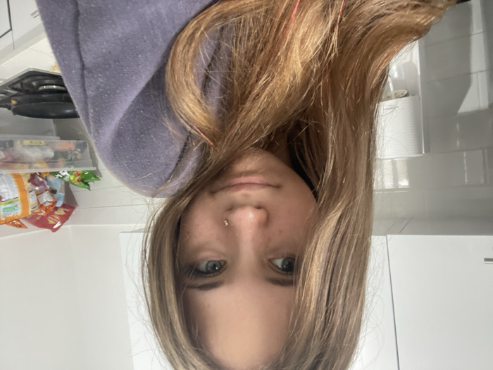 An indoor image depicts a young female partially facing the camera in a residential kitchen, located in Raanana, Israel. The female has long, light brown hair parted centrally, light-colored eyes, and a small silver stud piercing in her left nostril. She is wearing a greyish-purple long-sleeved garment with visible lint/pilling. The background features white upper kitchen cabinets with a single metallic handle visible, and a white tiled backsplash. A white wall-mounted water dispenser is affixed to the backsplash on the left. To the right, a clear plastic storage container holds various packaged snack items, positioned above a light-colored countertop. A stovetop with a dark frying pan rests on a burner to the right of the subject.