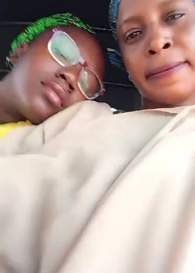 Two dark-skinned women are sitting close together indoors, possibly in a vehicle. One woman on the left has her eyes closed and is leaning her head on the shoulder of the woman on the right. The woman on the left is wearing glasses with a pink frame and a green headband. The woman on the right has a blue and black patterned headwrap on. She has silver hoop earrings and is looking at the camera. Both women are wearing cream colored shirts. Sounds of music and traffic can be heard in the background.