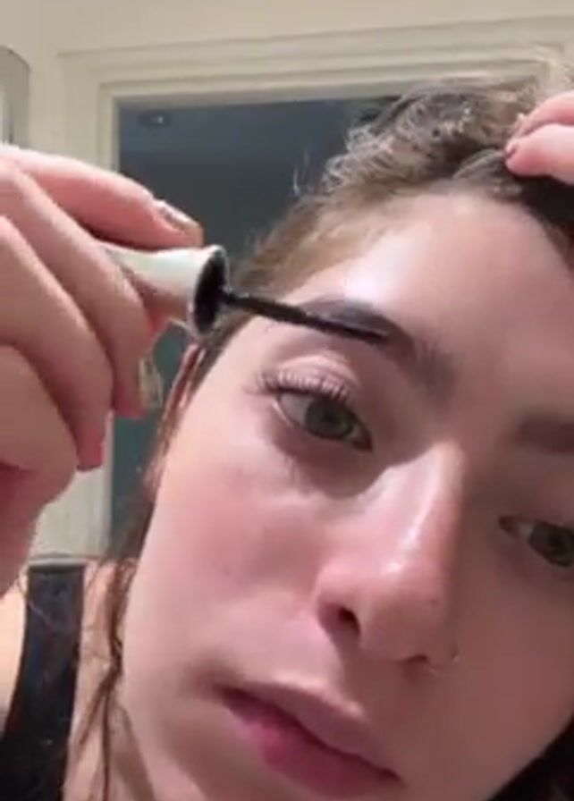 A young woman is in a bathroom, facing the camera. She appears to be applying eyebrow makeup with a small brush. The woman has light skin, light brown hair, and green eyes. She is wearing a black tank top and has a necklace on. The background shows a white door frame and a partially visible white door. The bathroom appears to be well-lit. The woman is focused on applying the makeup.