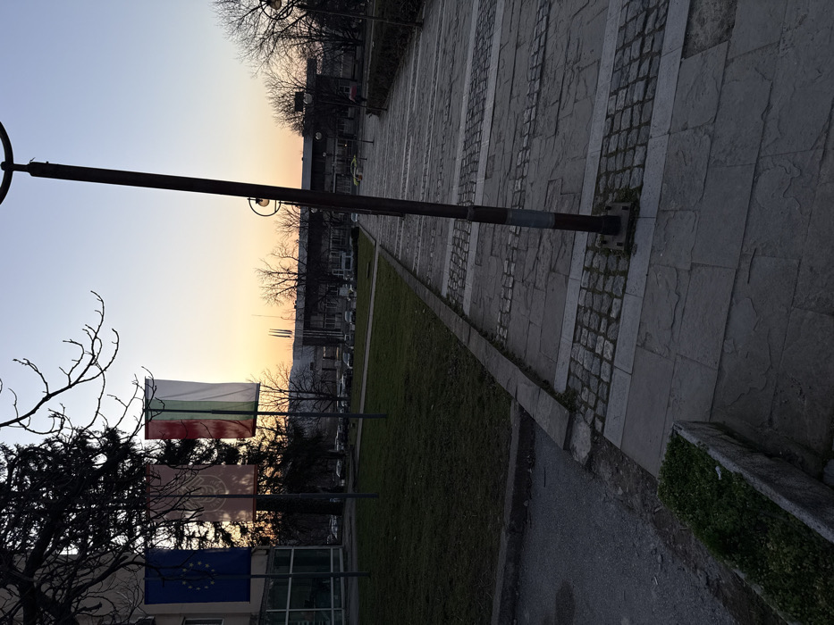 The image depicts an urban landscape in Cherven Bryag, Bulgaria, during either sunrise or sunset, characterized by a clear sky and an orange-pink hue on the horizon. The scene is viewed from a slightly elevated perspective, looking towards the distant horizon. In the immediate foreground, a dark gray asphalt or gravel surface is visible on the far left, bordering a rectangular concrete planter box containing small green plants. Adjacent to this is a meticulously maintained grassy lawn where three flagpoles are erected. From left to right, these display the blue European Union flag with yellow stars, a reddish-brown flag featuring a light-colored crest or emblem, and the national flag of Bulgaria (white, green, and red vertical stripes). Behind these flags and partially obscured by bare-branched trees, a modern building with extensive glass windows and a light-colored facade is visible. To the right of the grassy area, a wide paved pathway extends into the distance, constructed from alternating sections of light grey flagstones and darker cobblestone patterns. A tall, dark metal streetlight pole with a circular fixture is prominently positioned on the right side of this pathway in the foreground, leaning slightly to the left. Additional similar streetlights are visible further along the path. In the mid-ground and background, numerous deciduous trees with bare branches are scattered, silhouetted against the sky. Several parked vehicles are discernible in the distance, indicating a parking area or street beyond the main pathway. Faint outlines of hills or mountains are visible on the far horizon. No discernible people or direct interactions are evident within the frame. The lighting suggests a tranquil, low-activity period of the day.
