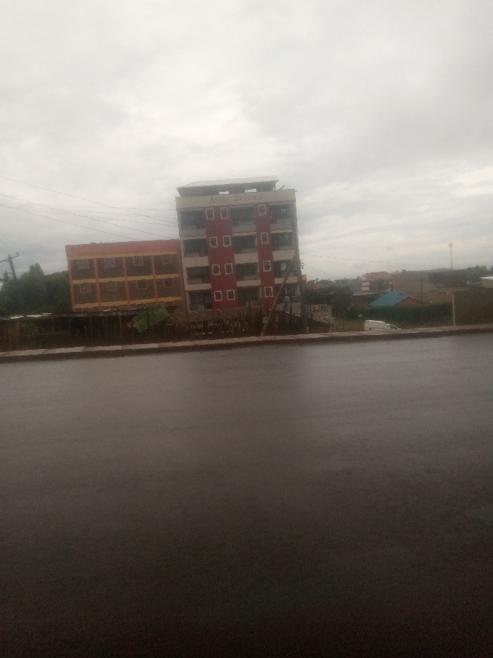 This image depicts a street scene in Ngong ward, Kenya, under an overcast sky. The foreground features a wide, dark, reflective surface, consistent with a wet asphalt road, stretching across the lower third of the frame. A low, dark barrier or wall separates this surface from the immediate area of the buildings. In the mid-ground, two multi-story buildings are visible. The dominant structure on the right is a six-story building with a light-colored base and distinct red panels on each floor containing multiple white-framed square windows. The top of this building features a rooftop structure, and the text "ASTRA STUDIOS" is discernible on its facade just below the roofline. To the left of this building, a four-story structure with an orange-brown exterior and darker-framed rectangular windows is present. Behind these buildings, a mix of trees, foliage, and other, smaller residential or commercial structures with varying roof colors, including one with a blue roof, can be observed. A tall, thin communications tower is visible on the horizon towards the far right. Utility poles and overhead wires are present on the left side of the scene. No individuals are visible. The overall lighting suggests a cloudy day.
