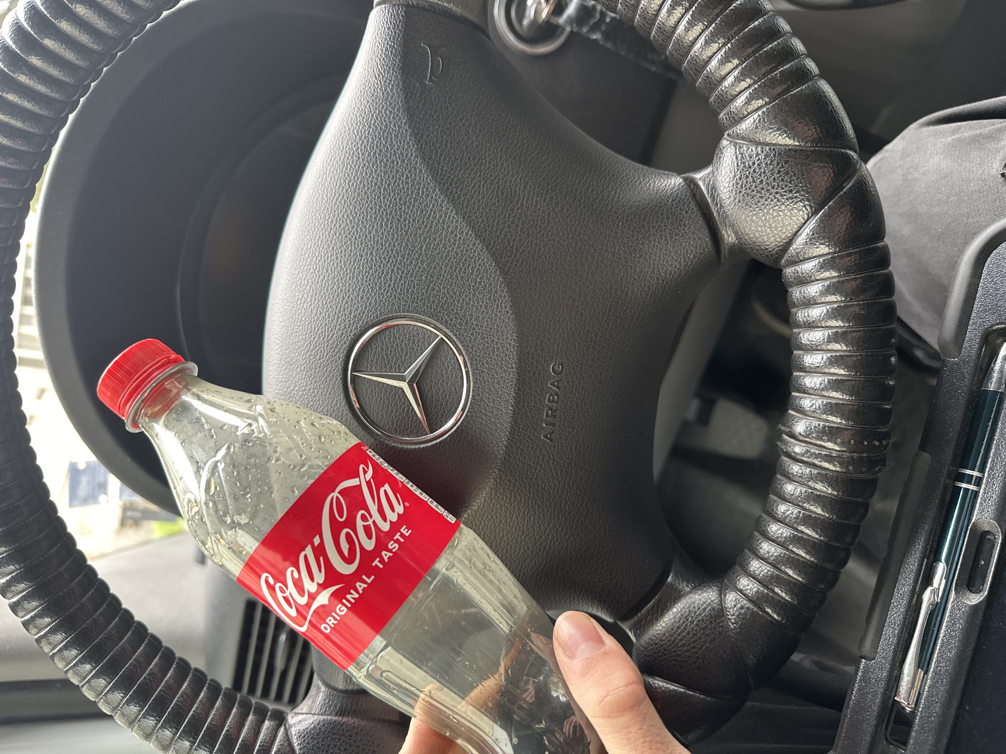 An interior view of a vehicle, possibly a Mercedes-Benz, shows a black steering wheel with the Mercedes-Benz logo prominently displayed. An empty, plastic Coca-Cola bottle with a red cap and label is held in a hand and positioned in front of the steering wheel. A black pen is visible in a holder near the edge of the frame. The location is not identifiable as Sofia, Bulgaria from the given image.