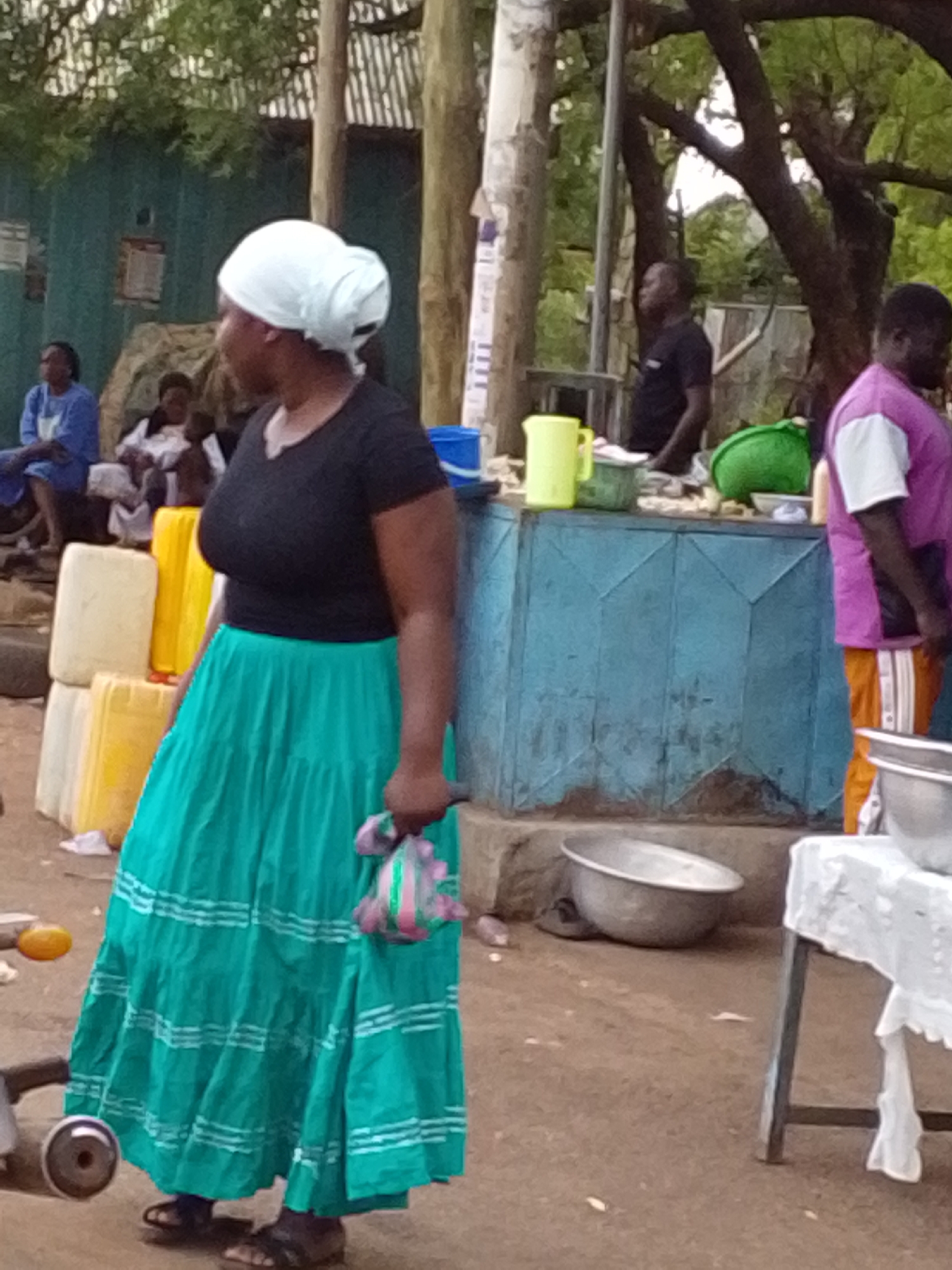 street scene in Tamale, Ghana. A woman wearing a white headwrap, a black t-shirt, and a turquoise skirt stands in the foreground. In her hand is a multicolored object. Behind her are several yellow jerrycans. To her right, a blue metal structure serves as a makeshift stall, with a yellow pitcher and other containers on top. A man in a black shirt stands behind the stall. Further to the right, another man in a purple shirt and orange pants stands near a table covered with a white cloth. In the background, other people are sitting or standing near a green building. Trees are visible behind the buildings. The ground is dirt.