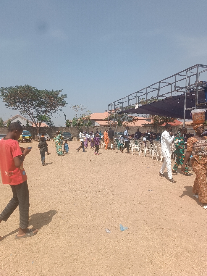 A daytime outdoor scene depicts a gathering of people. Many stand and walk across a dirt-covered ground. Some wear colorful traditional clothing. Seating is arranged under a metal framework structure with dark fabric draped on top. A woman balances a container on her head. A young man in a red shirt looks at his mobile phone. Cars are parked near a building in the background. The sky is clear and blue.