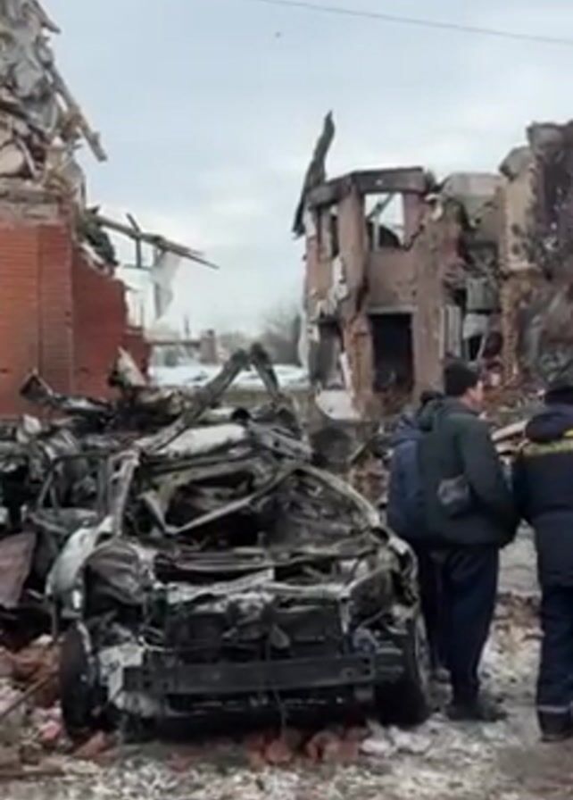 scene of destruction. A severely damaged, likely burned-out car sits in front of a ruined brick building. Debris is scattered across the ground. Three men stand beside the car, with the individual on the right wearing a dark uniform with a yellow patch on the back. The sky is overcast.
