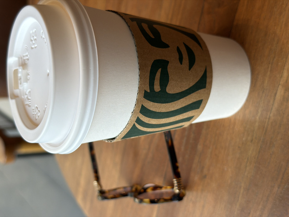 A Starbucks coffee cup, complete with a white lid and a brown cardboard sleeve featuring the Starbucks logo in dark green, sits horizontally on a wooden surface. Beneath the cup, a pair of tortoiseshell eyeglasses lies with the arms extended, their frames visible against the wooden background. The scene is a close-up shot, focusing on the coffee cup and eyeglasses.