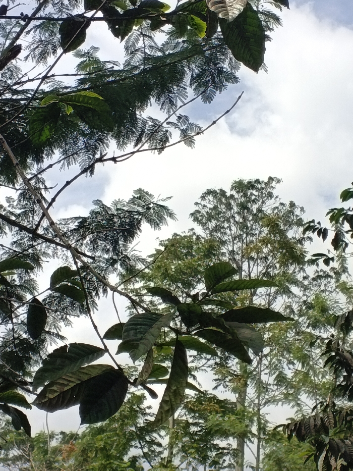 A lush canopy of trees and foliage fills the frame, looking upwards towards a cloudy sky