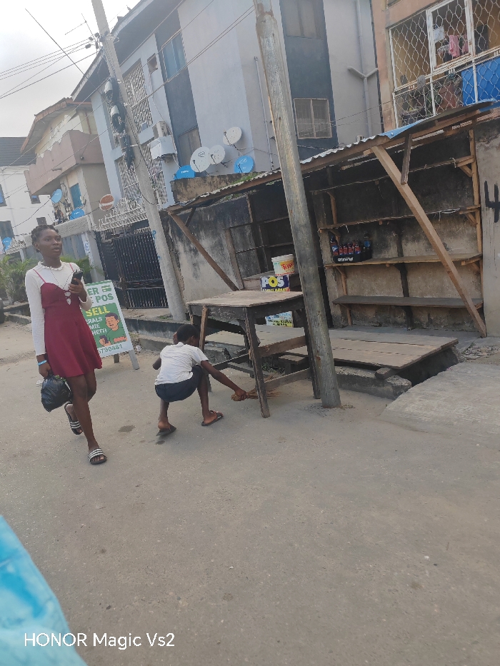 The image depicts an outdoor street scene in an urban area of Nigeria; the precise location within the city of Str is not discernible from the visual information. The scene is illuminated by daylight. In the left foreground, a young adult female, estimated mid-20s, with dark hair, walks from left to right. She wears a white long-sleeved top beneath a sleeveless deep red dress, striped open-toed sandals, a blue wristband, and a necklace. She carries a black plastic bag in her left hand and a smartphone in her right hand, held near her face. Behind her, a green and white freestanding sign displays "SUPER POS", "BUY", "SELL", a phone number, and a cartoon image of a person. To the right of the female, slightly further back, a male child, estimated 5-10 years old, wearing a light-colored t-shirt, dark shorts, and brown flip-flops, is squatting on the asphalt/concrete road. He holds a small broom or brush and appears to be sweeping the ground near the leg of a rustic wooden table. A white bucket labeled "POS" rests on this table. Centrally positioned, a dark utility pole rises vertically, with electrical wires extending overhead. To the right of the utility pole, a makeshift vendor's stall features a corrugated metal roof supported by wooden beams. The stall includes at least two empty wooden shelves, with a crate containing several bottled beverages on the upper shelf. In the background, multi-story residential or commercial buildings line the street. The building on the left is light-colored, while the more prominent building on the right is grey with dark sections and features multiple satellite dishes (white, blue, orange) affixed to its facade. Windows with security grills are visible, and laundry hangs on a balcony on the top floor of the rightmost building. The road surface is grey, and no other vehicles or individuals are prominently visible within the frame.