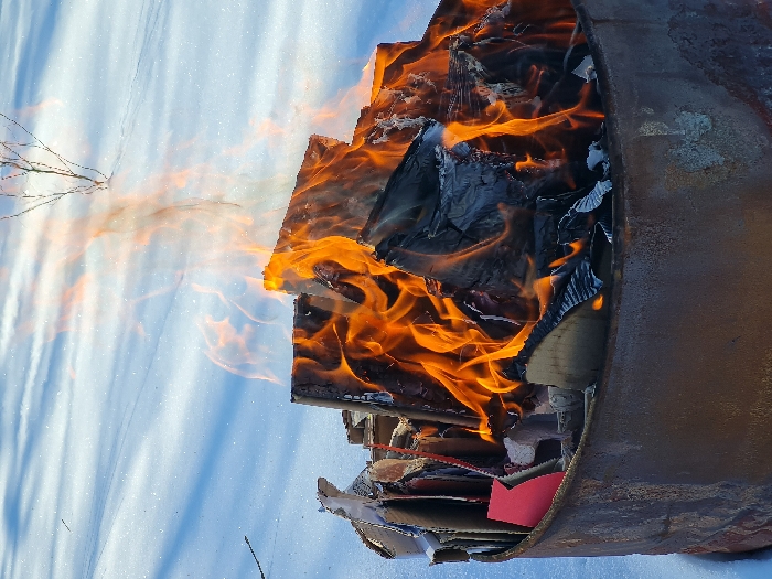 A rusted, cylindrical metal barrel is situated outdoors in the city of Noviy, Russia. Inside the barrel, an active fire is consuming various combustible materials, including visible paper and cardboard, producing bright orange flames and dark smoke. A distinct red material, partially unburnt, is visible on the left interior of the barrel. The barrel rests directly on a snow-covered ground surface, which exhibits white snow and discernible shadows, indicative of daylight conditions. A small, leafless shrub protrudes from the snow in the mid-ground. The background consists of a clear, light blue sky. No individuals are present in the scene.