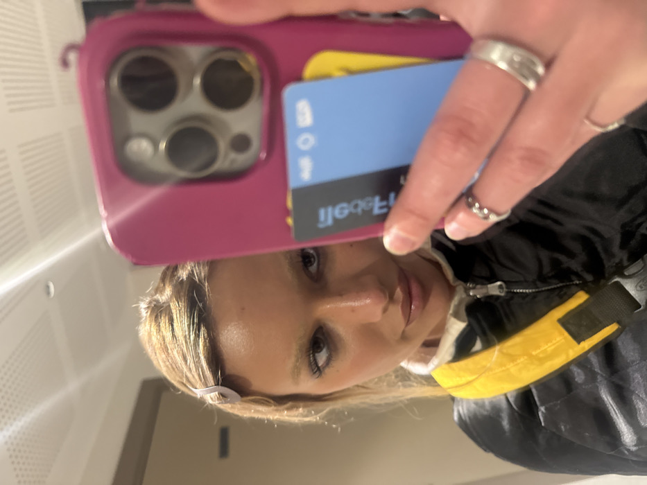 A selfie shows a person with blonde hair, light skin, and multiple rings on their fingers. They are holding a magenta phone case, with a bus pass and a blue card tucked behind. The phone has a triple-lens camera. The person is wearing a black jacket with a yellow accent. The background is a blurred, neutral tone, possibly a wall.