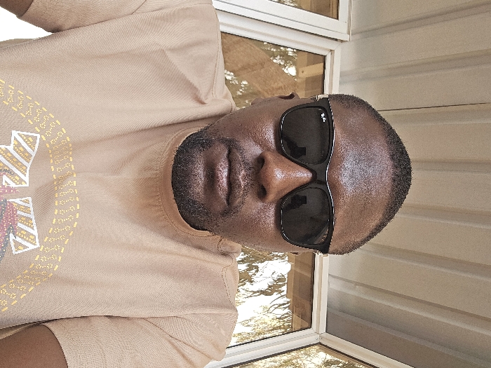 A close-up, eye-level selfie depicts an adult male from the chest up, positioned centrally in the frame. He has dark skin, short dark hair, and a short beard. He wears black, Wayfarer-style sunglasses, obscuring his eyes. His lips are closed, and his expression is neutral. He is dressed in a light brown short-sleeved t-shirt with a partially visible graphic design on the chest, featuring yellow, red, and white geometric patterns. The background consists of a light-colored, possibly corrugated or ribbed ceiling structure directly above his head. Behind him, white-framed glass windows or panels reveal blurred outdoor foliage and bright ambient light, suggesting an exterior or semi-enclosed setting during daytime. The specific location within the city of Jos, Nigeria, cannot be identified from the visual evidence presented in the image.