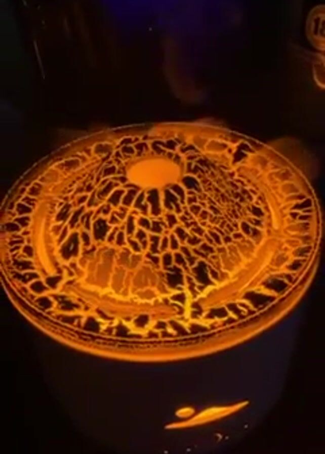 A small, round, white diffuser with an orange, cracked-earth design on top is the main focus of the video. The diffuser is emitting a light mist from the top. The light inside shines through the design, creating a lava-like effect. At the base of the diffuser, there is a small, lighted design of a sun and clouds. The background is dark and shows parts of a dark blue chair. The camera remains static and close to the diffuser throughout the short video. Music plays throughout.