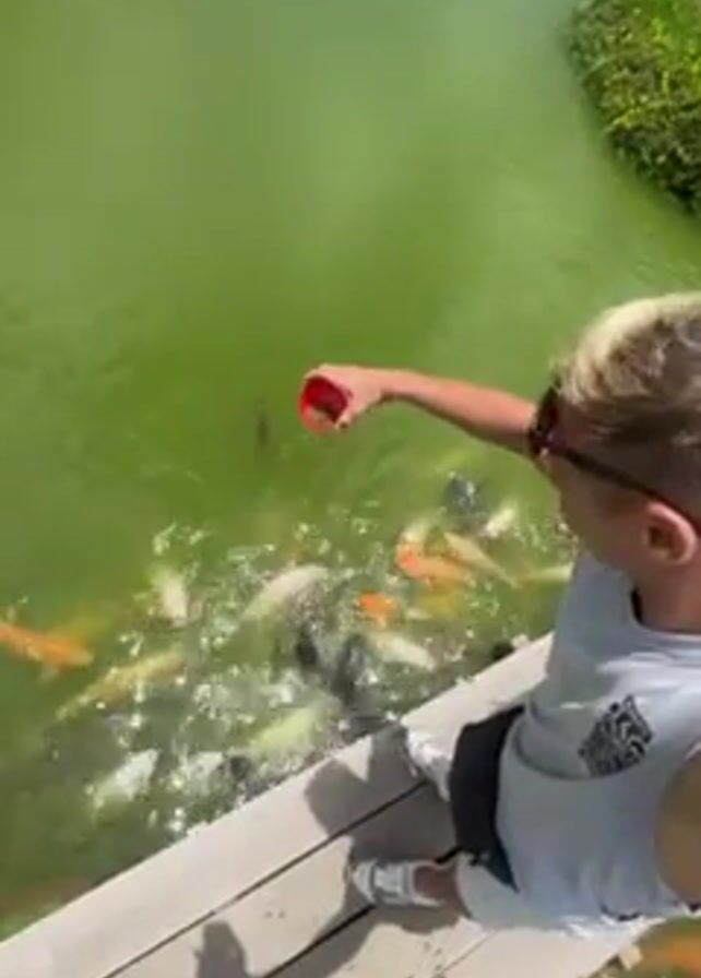 - "A man feeds koi fish from a red plastic cup, standing on a wooden walkway adjacent to a pond of green water" by FM-xgQP92, licensed under CC BY 4.0