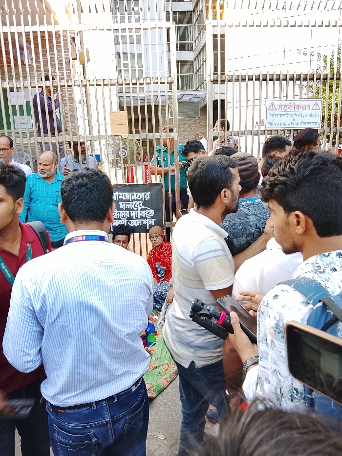 The image depicts a crowded scene outside the Election Commission building in Agargaon, Dhaka, Bangladesh, during daylight