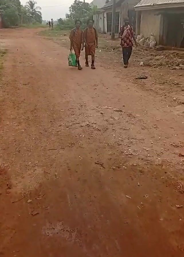 The scene unfolds on a dirt road in a rural area, with basic houses lining one side. Two young individuals, possibly twins, are walking towards the camera, dressed in matching, patterned outfits. One carries a green plastic shopping bag. A third person, dressed in a patterned shirt and dark pants, walks behind them and slightly to the right. The weather appears overcast. Additional figures are visible in the distance. The road is reddish-brown and somewhat uneven.