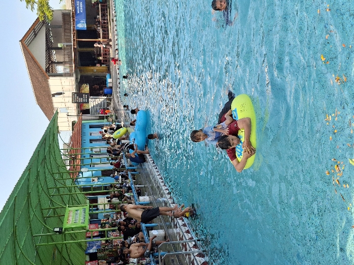 swimming pool located in the city of Kecamatan Tulung, Indonesia, at coordinates -7.592 latitude and 110.649 longitude. The pool is surrounded by a deck with several people sitting and standing around, including a group of people in the background sitting at a table. In the pool, there are several people swimming and playing. Two people, a man and a young child, are riding a yellow inflatable ring. There is a blue inflatable ring in the background, not being used. The water in the pool is blue and rippled. There are leaves on the surface of the water and the water appears to be shallow, revealing the pool bottom. The scene is set against a backdrop of a building with a green roof, palm trees, and blue sky. The building appears to be part of the swimming pool complex.