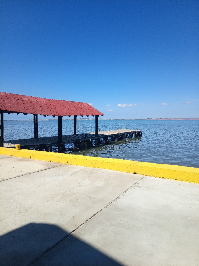 A pier with a red roof extends over a body of water under a clear blue sky. Black support posts and tires are visible beneath the pier. A yellow curb borders a gray concrete surface in the foreground. The water appears calm, and land is visible on the distant horizon. A dark shadow is cast on the concrete.