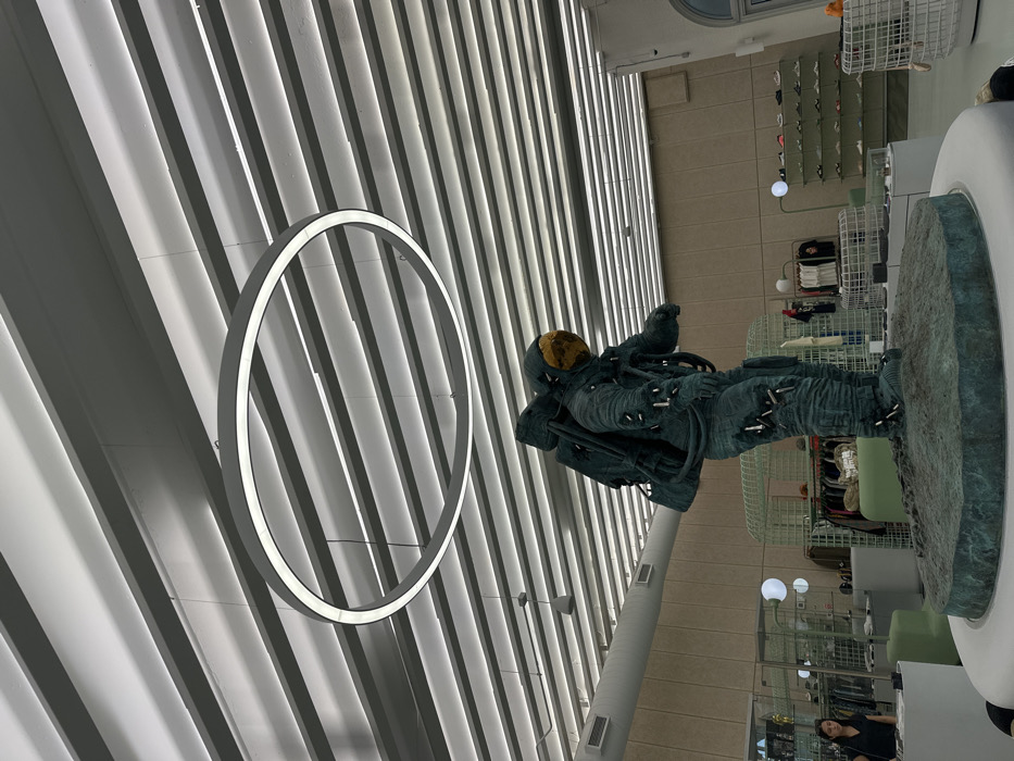 This image depicts the interior of a high-end retail space, specifically the Louis Vuitton store in the Miami Design District, Miami, Florida, United States. A large, teal-colored statue of an astronaut, textured to resemble distressed metal or concrete, stands centrally on a dark teal, moon-like base, which rests on a white cylindrical pedestal. The astronaut's helmet features a gold-tinted visor, and small, silvery cylindrical objects are affixed to various parts of the suit. The figure is posed as if taking a step forward. The ceiling consists of parallel white slats with integrated linear LED lighting, providing bright illumination throughout the space. A large, white circular LED ring light fixture hangs from the ceiling directly above the statue. The walls are a light beige color, and an exposed grey ventilation duct runs horizontally along the upper wall. In the background, various retail displays are visible, including light green wireframe structures, clothing racks with garments, and glass display cases. A wall-mounted shelving unit on the far right showcases multiple pairs of sneakers. One female individual with dark hair, wearing a dark top, is visible on the left side of the frame, standing behind a white counter, facing partially towards the right.