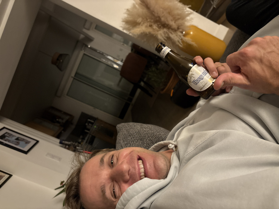 A smiling adult male is depicted in a medium-close self-portrait, seated on a grey upholstered sofa within an indoor residential setting in Cachan, France. The man, with light-colored short hair and a light complexion, wears a light grey hooded sweatshirt and displays a full smile, revealing teeth. He holds an opened, small brown glass bottle of 'Hoegaarden' beer in his left hand. His right hand is visible with the thumb extended upwards in a positive gesture, and a ring is present on his left ring finger. The background features a white wall with framed pictures, a partial view into an adjacent room with wooden cabinetry, stainless steel appliances, and a glass sliding door. A dark brown chair and a potted plant are visible in the mid-ground. To the right, a tall yellow vase holds decorative dried pampas grass. The scene is illuminated by ambient artificial light.