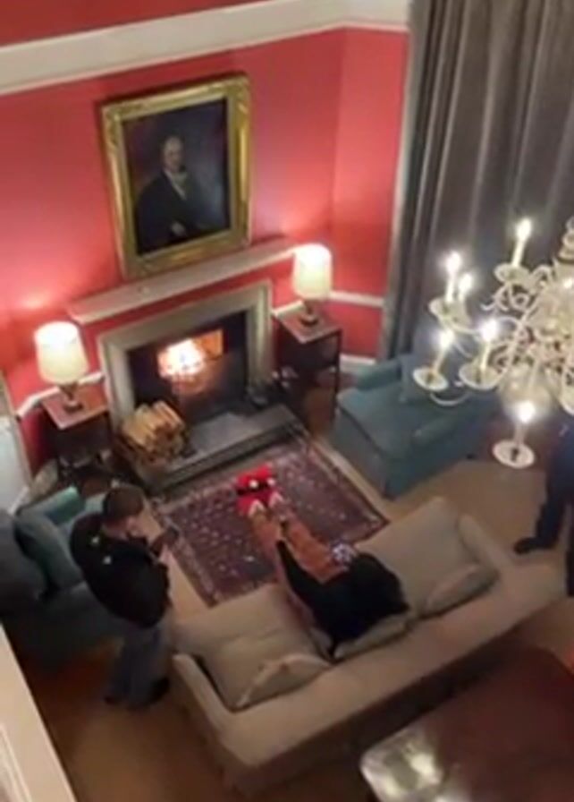 From a high vantage point, the video shows a room with red walls, a fireplace with a fire burning, furniture, and people