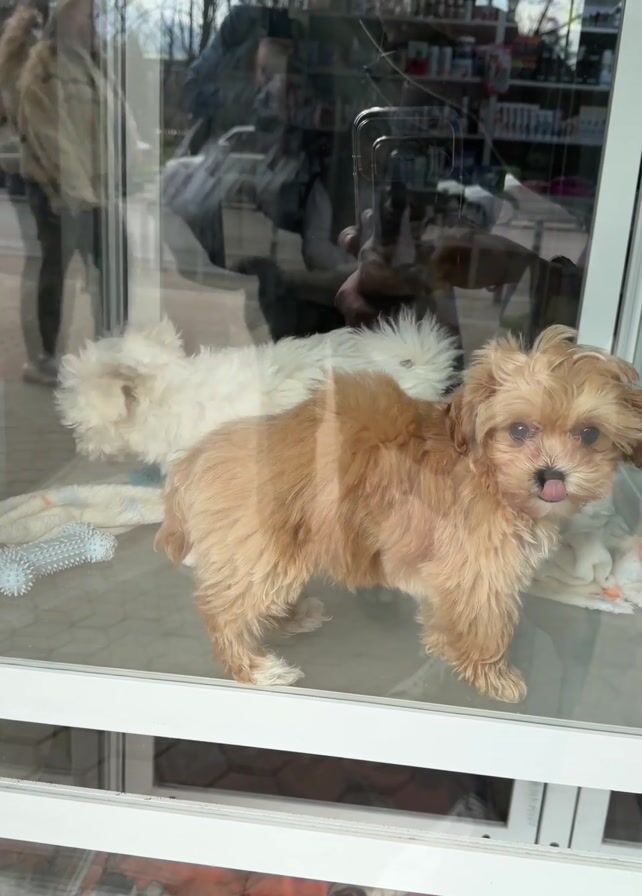 Two small puppies, one white and one tan, are standing inside a glass enclosure. The tan puppy is standing near the front of the enclosure, looking forward. The white puppy is behind the tan puppy. They are on a white and patterned blanket. Through the glass, reflections of people and cars can be seen. The puppies start to play together.