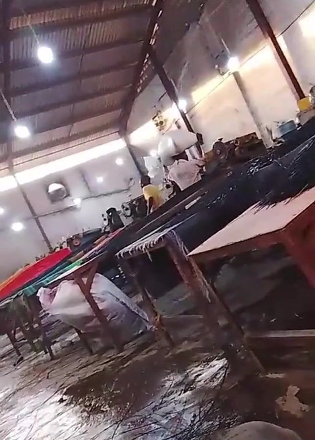 interior of a large, open warehouse-like space. The roof is corrugated metal and supported by exposed beams. Numerous overhead lights illuminate the area. Tables are arranged in a row, covered with what appears to be black and other colored material. There is a person working at the far end of the tables. The floor is uneven and covered with debris, including what looks like thin, dark strands of material. There are several pieces of equipment visible further in the background of the warehouse. The camera pans upwards to give a wider view of the space.