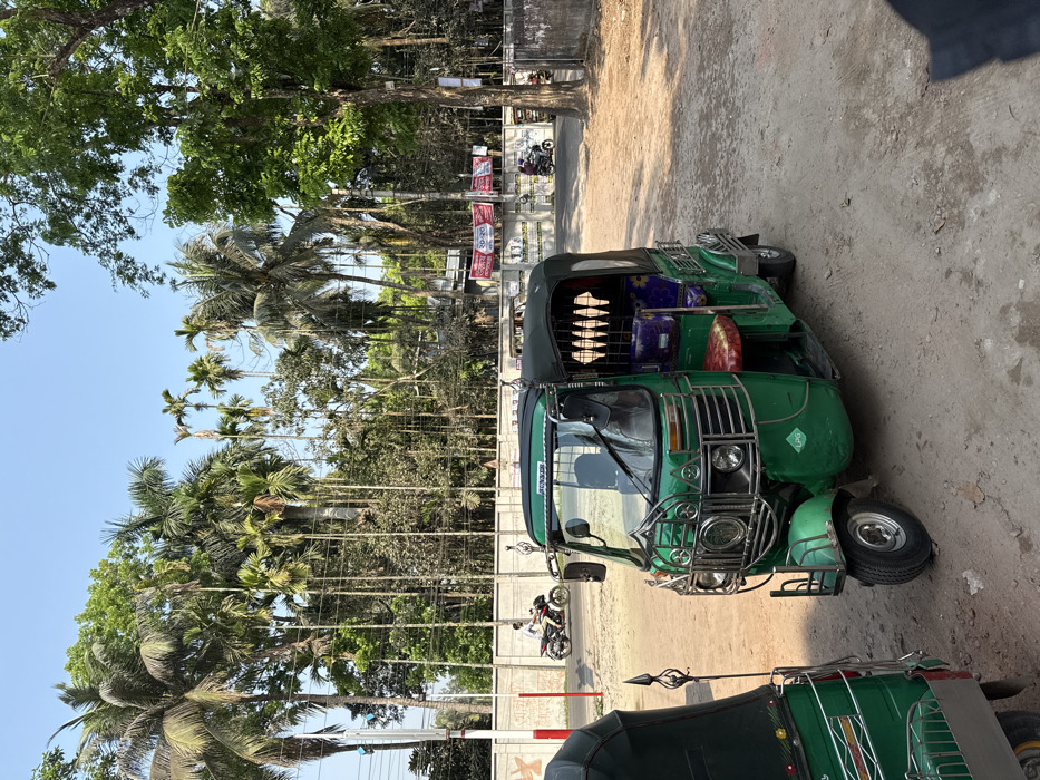 A green auto-rickshaw is parked on a dirt road in the city of Bhola, Bangladesh (latitude: 22.672, longitude: 90.656). It is parked in front of a concrete wall that is covered with palm trees. The auto-rickshaw has a metal frame and is decorated with chrome accents. The interior is visible, and it has purple and red seats. There are red and white signs on the wall behind it. Another auto-rickshaw is partially visible on the left side of the image. The auto-rickshaw's front wheels are turned to the left, and the back wheels are straight. There is a small patch of green grass to the right of the auto-rickshaw. The weather is sunny and clear. The trees in the background are tall and thin, with lush green leaves. There are no people in the photo. The street is empty except for the parked auto-rickshaw. The photo was taken in the afternoon.