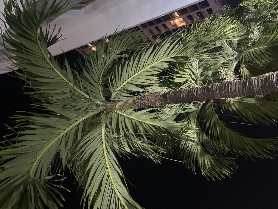 The image displays an upward-angled nighttime view within Nha Trang, Vietnam. A prominent palm tree dominates the central and left portion of the frame, illuminated by an artificial light source, casting a bright green hue on its fronds. The tree's trunk exhibits a textured, ringed pattern. Dried organic material is visible near the base of the crown. Partial fronds from additional palm trees are present in the lower right and mid-left. On the right side, a tall, multi-story building, characterized by a light-colored facade, rises vertically. Several windows on this structure emit a warm, orange interior light. The background is a dark, cloudless night sky. No individuals or specific actions are depicted.