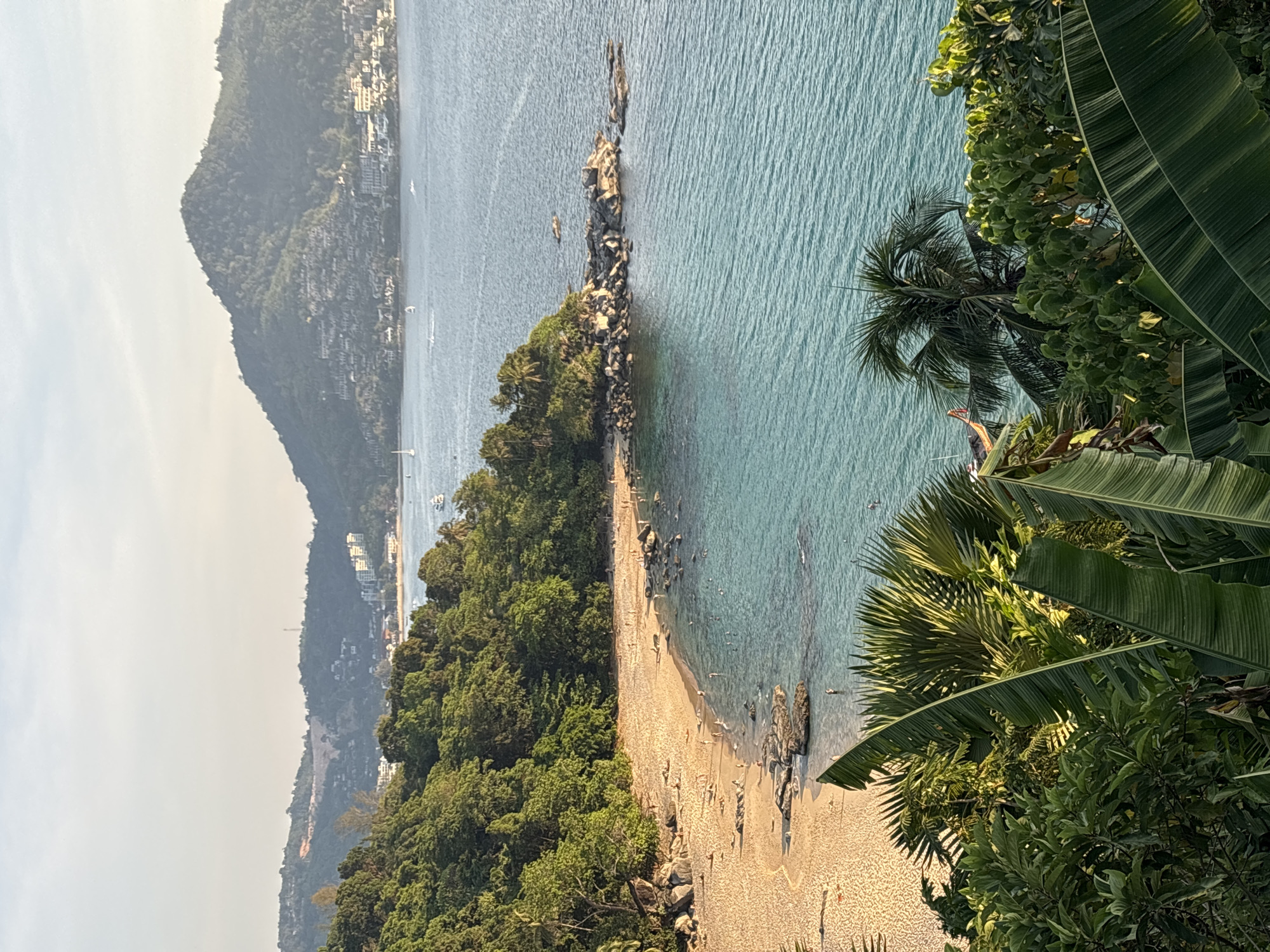 The image captures a tropical beach scene in Ban Bang Thao, Thailand. The beach is sandy with rocky areas where it meets the turquoise water. Lush green trees and foliage frame the right side of the image. In the distance, a mountain range with buildings clinging to its slopes is visible under a slightly hazy sky. Several boats dot the horizon. People are on the beach, some appearing to swim in the water.