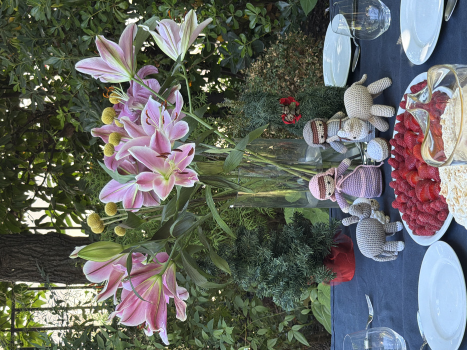 This image displays an outdoor table setting in Lo Barnechea, Chile. A dark-colored tablecloth covers the table, arranged against a backdrop of dense green foliage, a visible tree trunk, and a section of dark fencing. A tall, clear glass vase containing a bouquet of blooming pink and white lilies and several yellow spherical flowers stands prominently in the center. To the left of the vase, a small artificial evergreen tree is situated in a red base. To the right, another small artificial evergreen tree is adorned with a diminutive red and green decoration. Four crocheted figures are positioned on the tablecloth: a grey elephant, a light purple-clad female figure with a pink bonnet, a grey-clad male figure with a grey head covering, and a light beige donkey or horse figure. A small grey spherical crocheted object rests near the central figures. Food items include a white platter mounded with fresh red raspberries and sliced strawberries, and a visible portion of a white dessert, likely meringue, partially obscured by a clear glass. The table is set with multiple white dinner plates, clear stemless wine glasses, and silverware. No people are present within the scene.
