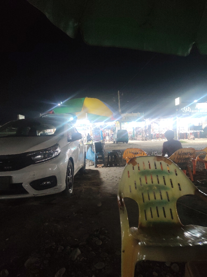 This image depicts an outdoor night scene in Peurupok, Indonesia, illuminated by numerous artificial light sources. In the immediate foreground, the back and right side of a light-colored, possibly yellowish-green, slatted plastic chair is visible. Above, the dark green fabric of what appears to be a large canopy or umbrella partially covers the top of the frame. To the left in the midground, a white Honda Brio vehicle is parked, facing left, with its headlights brightly illuminated, causing lens flare. Adjacent to the vehicle and extending into the midground, several orange plastic chairs are arranged. One individual is seated in an orange chair, facing away from the camera, observing the background activity. Near these chairs, a small stand or cart with a blue bag hanging from it is present. The background reveals a bustling night market or street stall area, characterized by bright lights, colorful umbrellas (including a prominent green and yellow one), and multiple vendor stalls. Signs with text, including "Computer" and partially legible Indonesian script ("Ahad Harga Bulan..."), are visible. Several individuals are dispersed throughout this background area, appearing to browse or interact with the stalls. A dark-colored vehicle is also present further in the background. The ground throughout the scene appears unpaved, consistent with dirt or gravel.