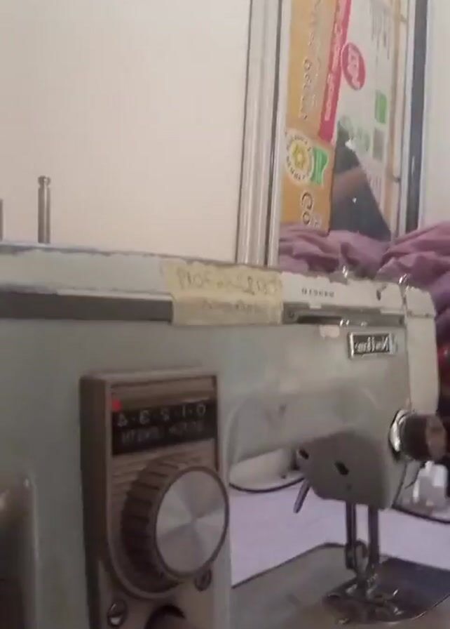 close-up of a vintage New Home sewing machine. The machine is light gray in color and has a control panel with a dial on the left side. The background includes a white wall and a framed object that looks like a cardboard box. The sewing machine is visibly old and has a sticker on top. The video starts with a blurry focus and then sharpens to reveal the details of the sewing machine. There is movement as if the machine is being used, with possible sounds of the sewing machine.