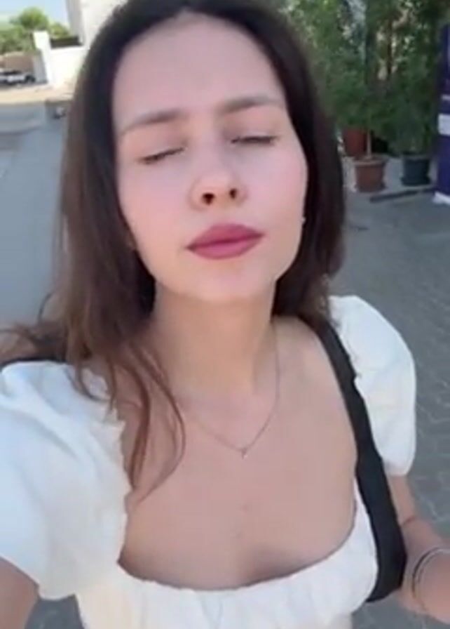 A woman is recording herself with a mobile phone. She has long brown hair and is wearing a white top with puffy sleeves, a delicate necklace, and carrying a black bag over her shoulder. She is walking down a paved street on a sunny day. There are buildings and some greenery behind her. She appears to be outdoors and mobile.