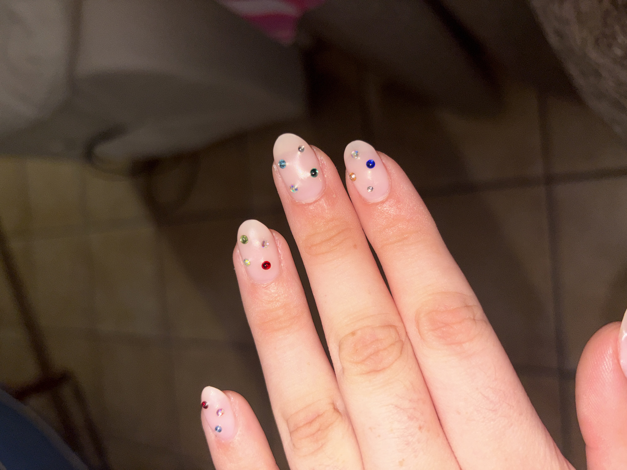 A close-up photograph, taken in Urbanización Encinares De Alcolea, Spain, depicts a left human hand with manicured fingernails. The fingers are slightly splayed, with the palm facing away from the viewer. Each visible fingernail is oval-shaped, coated with a clear or light pink polish, and adorned with multiple small, multi-faceted rhinestones of various colors. The thumb (partially visible) shows pink and blue gems. The index finger displays red, blue, and pink gems. The middle finger features red, green, and yellow gems. The ring finger presents blue, light blue, and green gems. The pinky finger exhibits orange, clear, and blue gems. The hand's skin tone is light. The background is out of focus, appearing dark and indistinct, consistent with an indoor environment under low lighting conditions. Vague shapes and tonal variations in the background suggest furnishings or structural elements, including a lighter-colored object in the upper right quadrant. No specific actions or interactions are depicted beyond the presentation of the hand.
