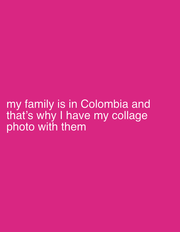 The scene, located in València, Spain, displays a digital graphic with a solid magenta background. White, sans-serif text is prominently featured in the lower-central portion of the frame. The text is arranged on three lines and reads: "my family is in Colombia and that's why I have my collage photo with them". No discernible people, objects, actions, interactions, or specific environmental features beyond the colored background and text are present in the image.