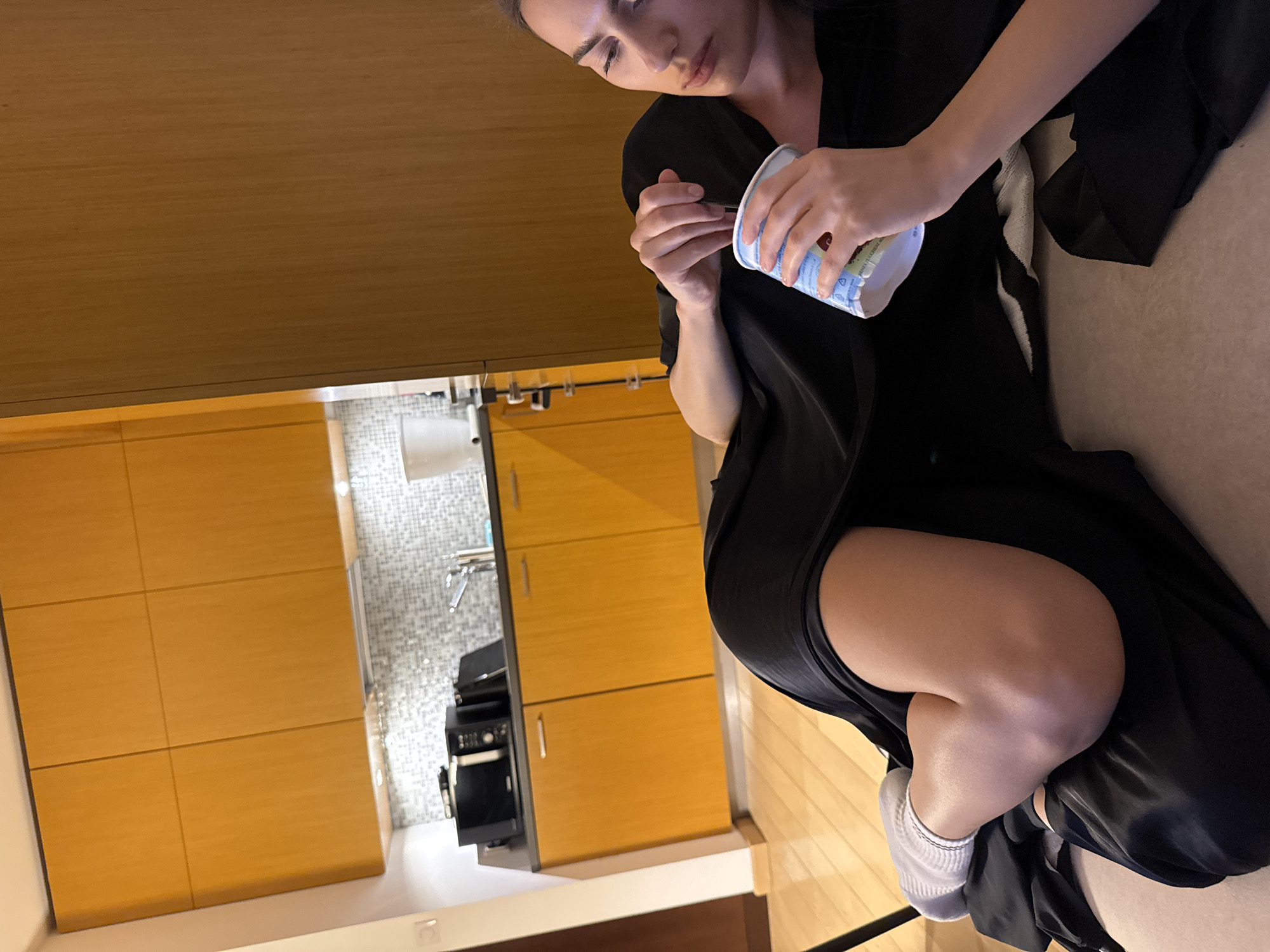 A woman is seated and consuming yogurt in an interior space. She is wearing a black robe and white socks. The background includes a kitchen area with wooden cabinets and a microwave. The location is likely Warsaw, Poland.