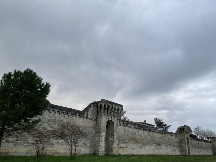 The image displays an external view of the historic city walls, or ramparts, of Avignon, France, under an overcast sky