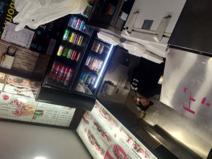 A blurry shot inside what looks like a fast-food restaurant. A soda cooler, food menu boards, and a worker in a black sweatshirt are visible. The countertops and some equipment are stainless steel. A white plastic bag hangs from the ceiling. The overall image is dark and out of focus, making details difficult to discern.