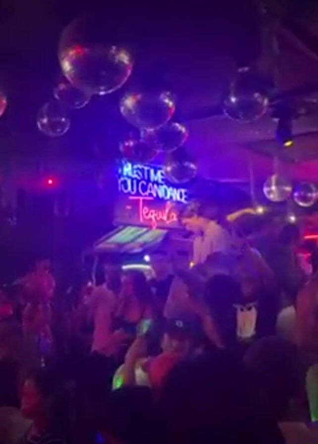 crowded club scene. The lighting is dark, with neon lights and disco balls hanging from the ceiling. A neon sign reads, "TRUST ME, YOU CANDANCE - Tequila". People are dancing and socializing. The camera focuses on the sign and the people in front of it. Some of the people are wearing hats and light-colored shirts. The overall atmosphere is lively and energetic.