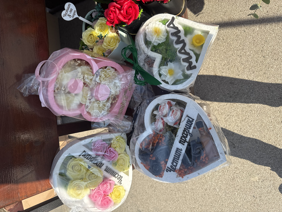 The scene displays five distinct gift arrangements, individually wrapped in clear cellophane, presented outdoors under direct sunlight which casts prominent shadows onto a light-colored ground surface. A dark brown wooden bench seat is visible in the background. The upper left arrangement is a white heart-shaped container filled with yellow and pink artificial roses, bearing the Cyrillic inscription "Честит празник!" (Happy Holiday!). Adjacent to it, a pink '8'-shaped container holds cream-colored artificial flowers, with a partially obscured Cyrillic inscription. Further right, a white picket sign reading "Честит 8-ми март" (Happy March 8th!) is placed among yellow artificial roses in a white container, next to a black container holding red artificial roses. The lower left arrangement consists of a white heart-shaped container showcasing dark artificial roses, orange decorative elements, and two packages of Raffaello chocolates, also inscribed with "Честит празник!". The lower right arrangement is a white heart-shaped container tied with a green ribbon, containing green artificial moss, white and yellow artificial flowers, and the Cyrillic word "MAMA" (Mom) in black lettering. The presence of Bulgarian language text, specifically referencing "8-ми март" (March 8th, International Women's Day), firmly places this commercial display within Bulgaria, consistent with a retail offering in Sofia.