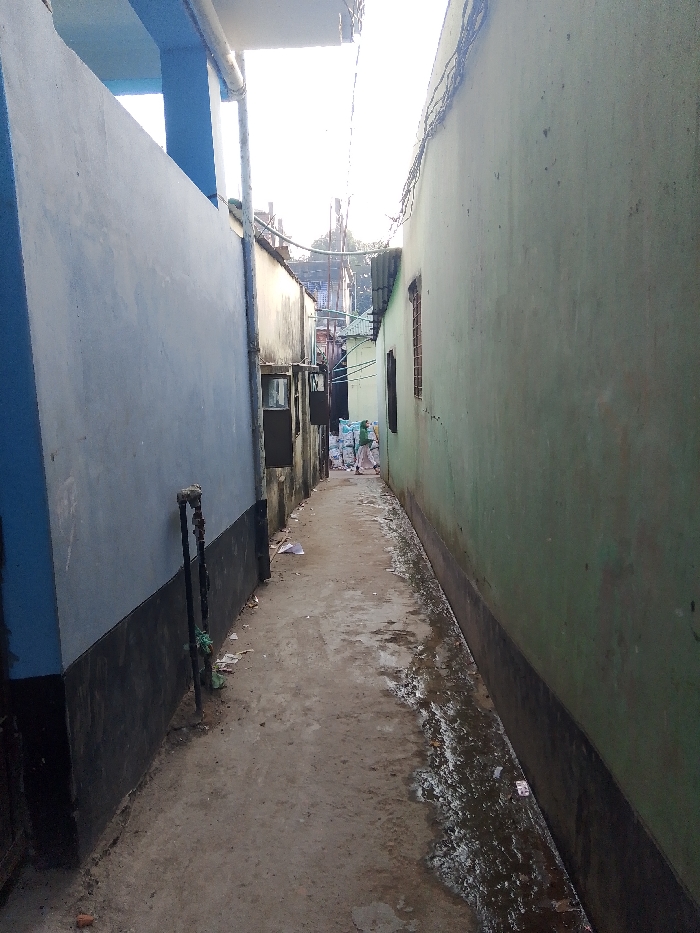 A narrow, poorly maintained alleyway stretches into the distance, bordered by tall, discolored buildings. The left building is a light blue color and the right is a dingy green. Water or sewage trickles along the base of the right wall, adding to the unhygienic feel. Trash and debris litter the ground. A person walks in the distance. The overall impression is of urban decay and neglect.