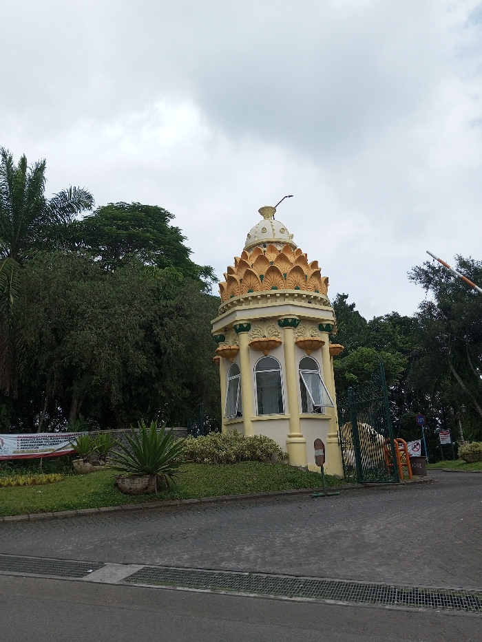 This image, captured in Vieng Phouka, Laos, presents an exterior view of a distinctive architectural structure, likely an entrance kiosk or guard booth, under an overcast sky. The central subject is a light-yellow, multi-sided structure with an ornate, conical roof. The structure features arched windows, with one on the right side of the visible facade slightly open. Four decorative columns, painted green and gold, support the roof. Below the roofline, small, light-colored, shell-like decorative elements are visible. The main roof is adorned with a pattern of orange-gold and white petal-like scales, resembling a stylized pineapple or lotus. A smaller, white dome caps the roof, surmounted by a dark, thin, upright object. In the foreground, a paved road with an interlocking paver surface extends across the bottom of the frame, featuring a metal drainage grate. To the left of the structure, a grassy incline holds various low shrubs, a larger spiky plant in a stone planter, and a partially visible white banner with red text. To the right of the structure, a decorative green metal gate with yellow scrollwork and a tiger motif is visible, partially open or angled. An orange and white striped barrier arm is positioned behind the gate. Adjacent to the gate are several signs, including a red circular "DO NOT ENTER" symbol and a blue rectangular sign displaying the number "227". An orange bin is also present near the gate. The background is dominated by lush, dense green foliage, including tall trees and a palm tree on the left. The sky is uniformly overcast with greyish-white clouds. No individuals or active vehicles are present in the scene.